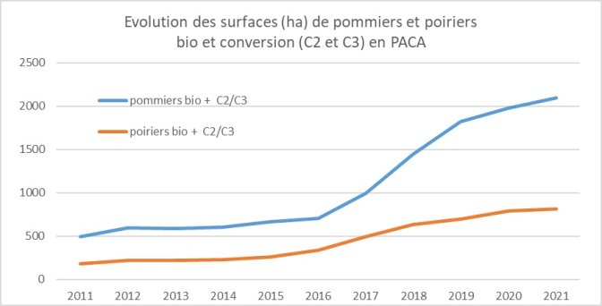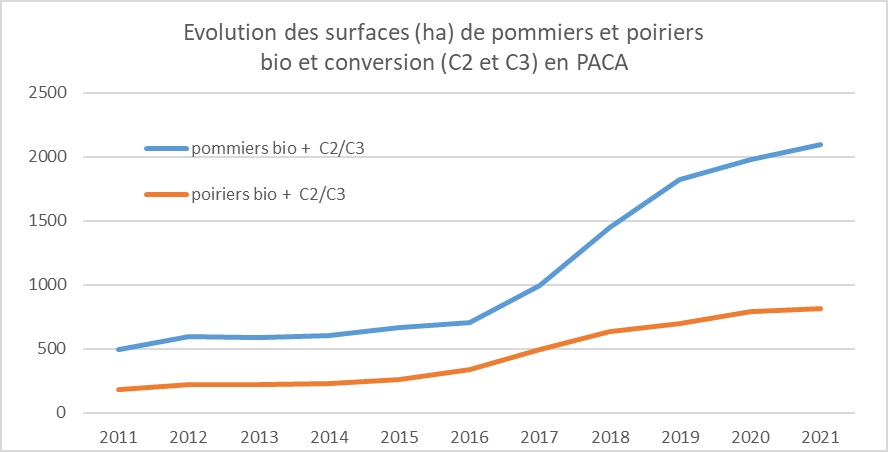 La récolte régionale en pommes et poires biologiques et conversion augmente de manière importante chaque année depuis 2015. Elle suit de manière logique l’augmentation des surfaces de vergers convertis à ce mode de production.