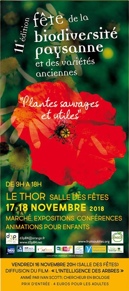 11ème édition de la fête de la Biodiversité sur la thématique cette année des "plantes sauvages et utiles". Du vendredi 16 (soirée) au dimanche 18 novembre au Thor (9h-18h).