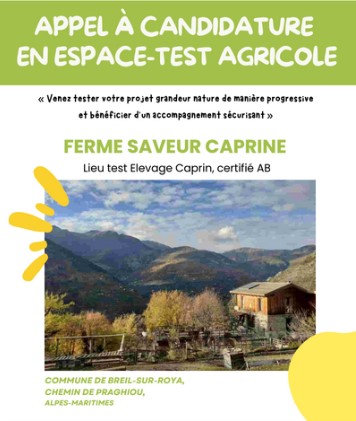 Veuillez trouver ci-joint un appel à candidature pour la mise à disposition d’une ferme en chèvres laitières certifiée AB, à transmettre dans la vallée de la Roya, via du test d’activité agricole avec Mosaïque-Mosagri.