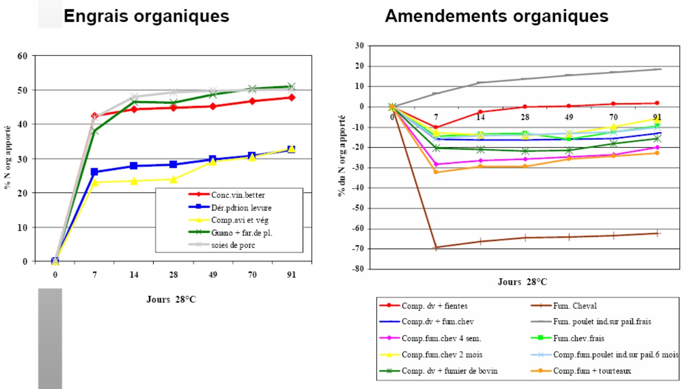 De ces essais, peut donc être mis en avant l’intérêt d’une fertilisation précoce des blés (dès mi-février si les conditions le permettent), au vu d’une diminution de la fréquence potentielle des pluies en climat méditerranéen avec la fin de l’hiver ou le début du printemps. Au vu de ce climat compliqué, et en l’absence d’irrigation, il est également conseillé de choisir des fertilisants capables de minéraliser rapidement. Des produits comme la vinasse de betterave, de soies de porc ou de guano avec des farines de plume ont une vitesse de minéralisation plus importante (50 % de minéralisation de l’azote sous 90 jours) comparé à d’autres produits (30% en 90 jours) (Figure 4).