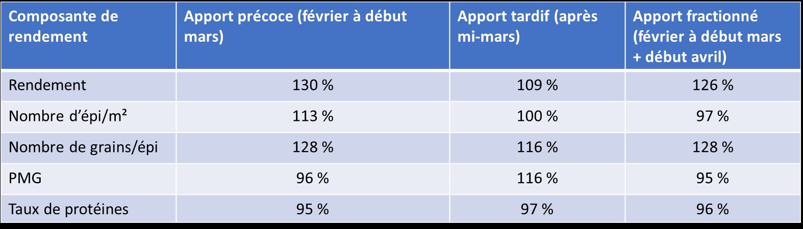 – Un apport tardif début à mi-avril (20 unités en moyenne) n’a pas permis d’augmenter de manière très significative le rendement, compte tenu de la présence moins importante de pluie à cette période, entrainant ainsi une moins bonne minéralisation ou son décalage par rapport aux besoins azotés du blé.