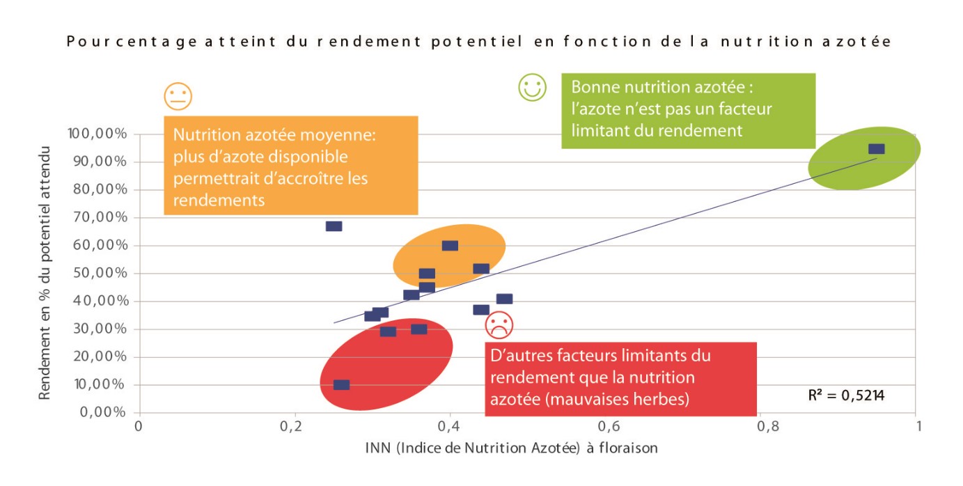 Figure 1 : Pourcentage atteint du rendement potentiel climatique du blé tendre en fonction de l’indice de nutrition azotée. Parcelles en agriculture biologique en région PACA diagnostiquées entre 2014 et 2017.