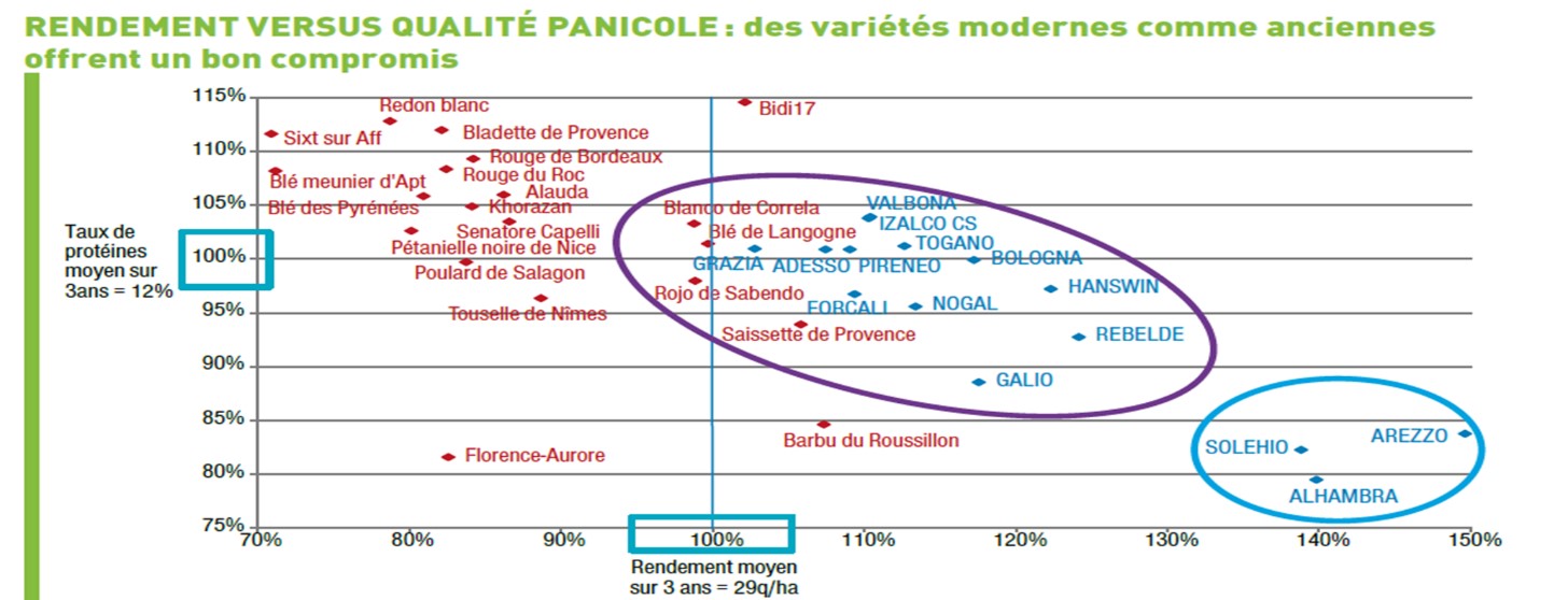 Figure 2 : compilation de trois années d’essais de variétés de blés tendres et poulards en sec et en irrigué en bio à Mane (sud des Alpes de Haute-Provence). En bleu figurent les variétés modernes et en violet les variétés paysannes. Le cercle bleu caractérise des variétés très productives, au détriment du taux de protéines, dans les conditions limitantes en azote usuelles en bio en région PACA. Le cercle violet regroupe des variétés offrant de bons compromis rendement/protéines. Graphique issu de Perspectives Agricoles