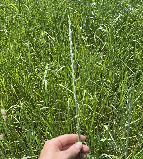 Gestion des adventices : Des interventions « classiques » sont possibles sur le Kernza® au cours de la culture – herse rotative, houe rotative ou binage (inter-rang). Si présence d’adventices qui dépassent le Kernza® en sortie d’hiver, réaliser un broyage au-dessus du Kernza® pour laisser pénétrer la lumière. Point de vigilance pour ne pas broyer trop bas, ce qui risquerait de sectionner les épis dans la gaine. En cas de bonne gestion des adventices, un désherbage ne sera pas nécessaire les premières années, mais seront à envisager sur une parcelle de Kernza® plus âgé.