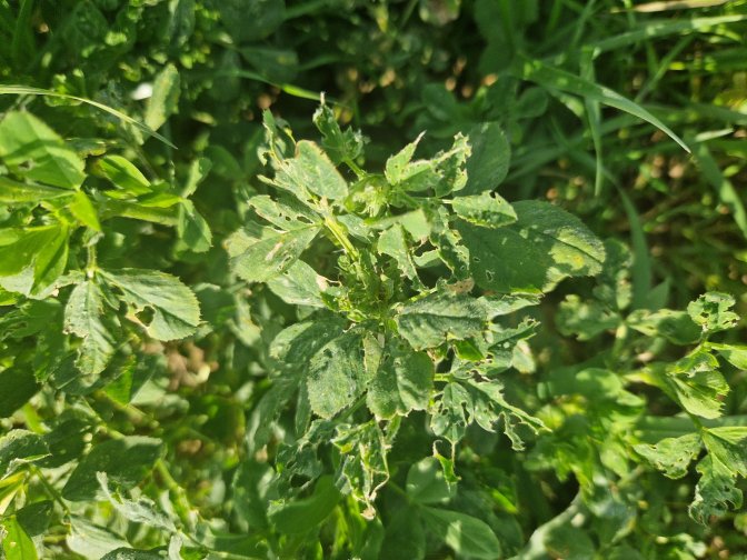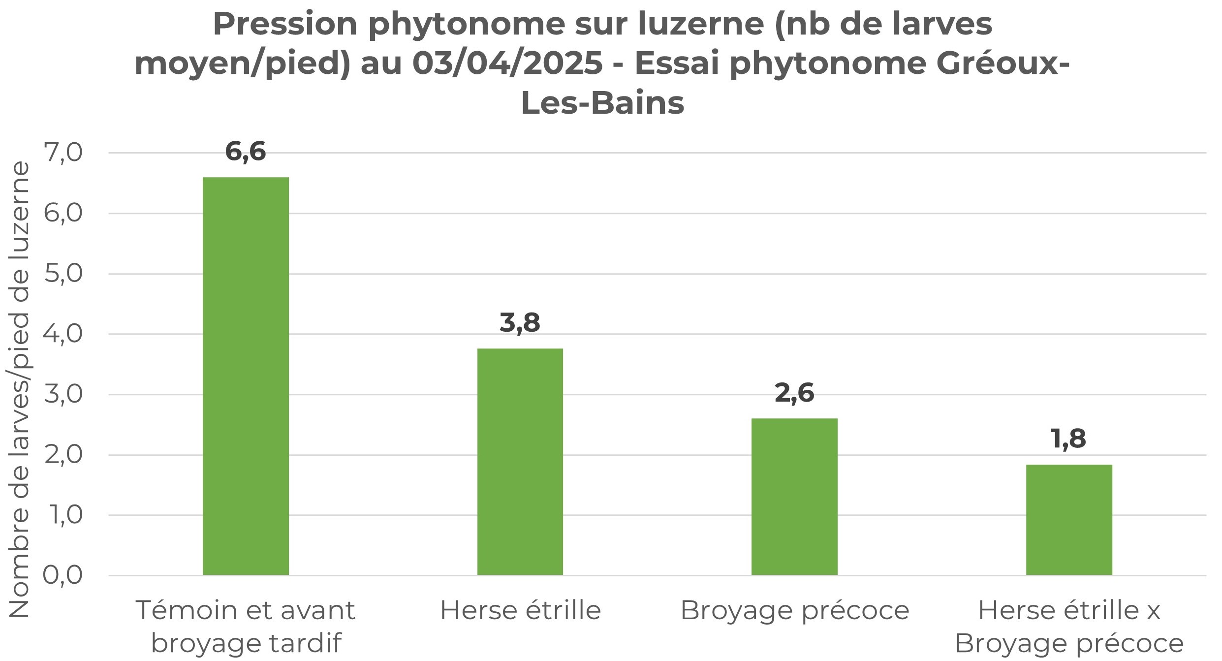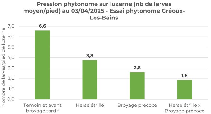 Dans le contexte de l’essai 2025, le hersage sur les premiers cm du sol (15/02/2025) et le broyage précoce (26/02/2025) de la luzerne ont permis de réduire drastiquement le nombre de larves présentes dans la parcelle, de 40 à 70% en fonction des stratégies testées. La pression phytonome était d’autant plus réduite lorsque les deux stratégies étaient combinées (1,8 larves/tige de luzerne en moyenne contre 6,6 larges/tige dans la modalité témoin).