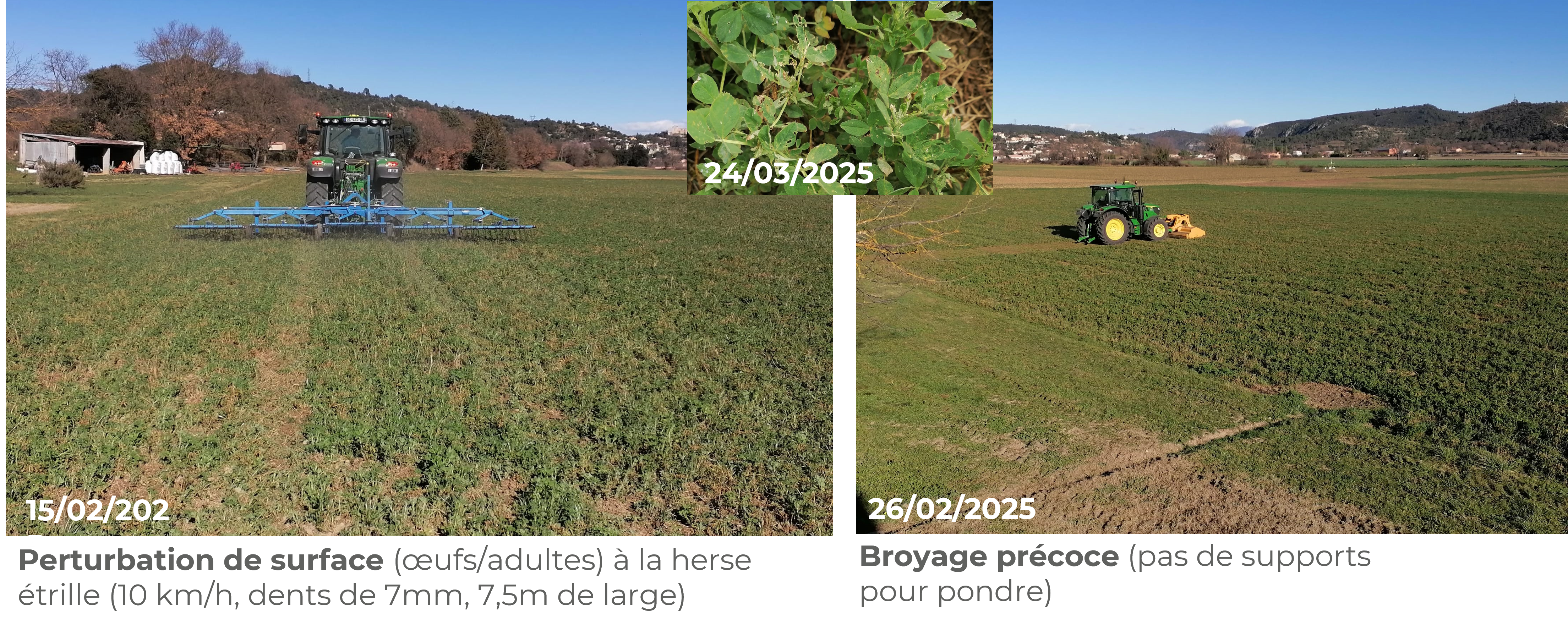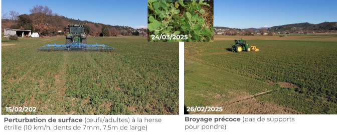Les 3 stratégies de gestion du phytonome étudiées étaient de : i) perturber le phytonome pendant sa phase d’hivernation par hersage (15/02/2025), ii) broyer précocement la luzerne pour supprimer les supports de ponte et/ou détruire les œufs (26/02/2025), iii) broyer plus tardivement la luzerne pour détruire les larves (pratique usuelle des agriculteurs enquêtés) (03/04/2025). Ces trois stratégies ont été comparées à une modalité témoin sans interventions mécaniques. L’essai a été mis en place sur la station expérimentale d’Arvalis à Gréoux-Les-Bains, dans une luzerne semée le 17/03/2023 à 20kg/ha implantée pour gérer une forte pression ray-grass (variété AZZURRA, type méditerranéenne).