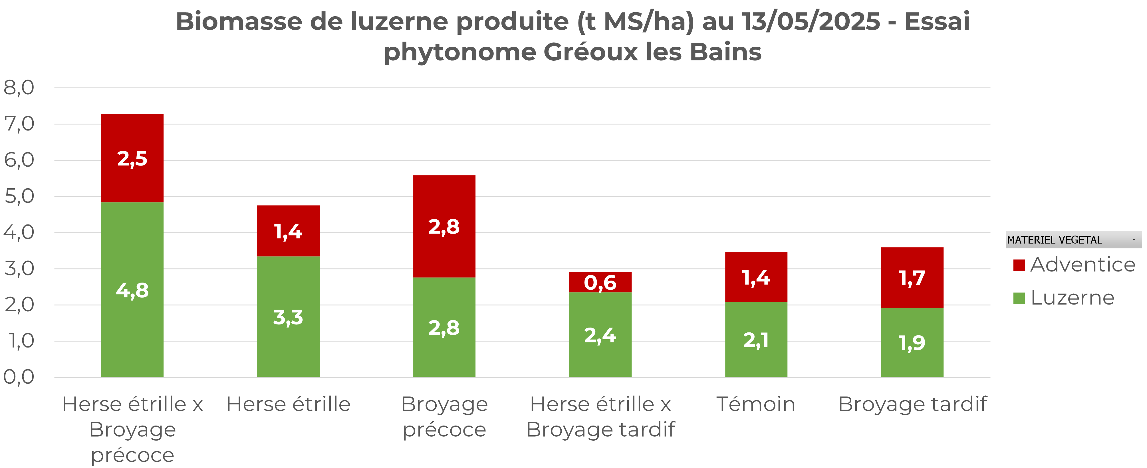 Les itinéraires avec broyage tardif n’ont pas permis d’améliorer la 1ère coupe par rapport témoin. Il pourrait même s’avérer préjudiciable en abritant des larves au stade de développement plus avancées sous les andains, laissant libre court à leur développement et à leur consommation des repousses de luzerne. Cette stratégie contre-productive entrainerait des pertes de vigueur, accentuerait le phénomène de verse, accélérerait le salissement des parcelles et réduirait les réserves racinaires de la luzerne. La 2nd coupe serait retardée et la longévité de la luzerne réduite. Ces éléments tirés de la littérature scientifique reste à vérifier dans notre contexte pédoclimatique.