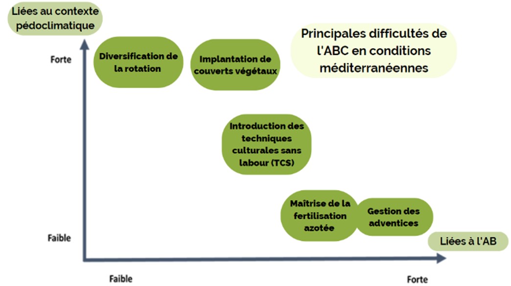 Le développement de l’agriculture de conservation des sols reste cependant limité en contexte méditerranéen pour plusieurs raisons. La couverture végétale et les adventices non maîtrisées accentuent la concurrence hydrique et azotée rencontrée en système céréalier bio méditerranéen. Le développement de ravageurs type campagnols est accentué par le non travail du sol et peut dans certains cas entraîner d’importantes pertes de rendement. Les couverts végétaux sont difficiles à implanter en sec et leurs développements limités à cause des fortes périodes de sécheresses et de chaleurs estivales (< 3 t MS/ha en moyenne). Le choix des cultures en sec est restreint, limitant la diversité végétale dans l’assolement et la gestion des bioagresseurs (adventices, ravageurs etc.) par l’alternance cultures de printemps / cultures d’hiver.
