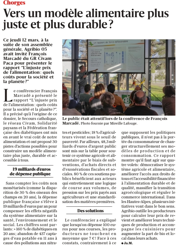 Une cinquantaine de personnes se sont réunies le jeudi 12 mars dans la salle mise à disposition par Territoires d’énergies 05 à Chorges pour l’assemblée générale d’Agribio 05, suivie de la conférence autour du rapport L’injuste prix de l’alimentation (par François Marcadé du GR CIVAM PACA). Les échanges se sont poursuivis autour d’une bière et d’un repas à l’Apex Brewpub à quelques minutes à pied...