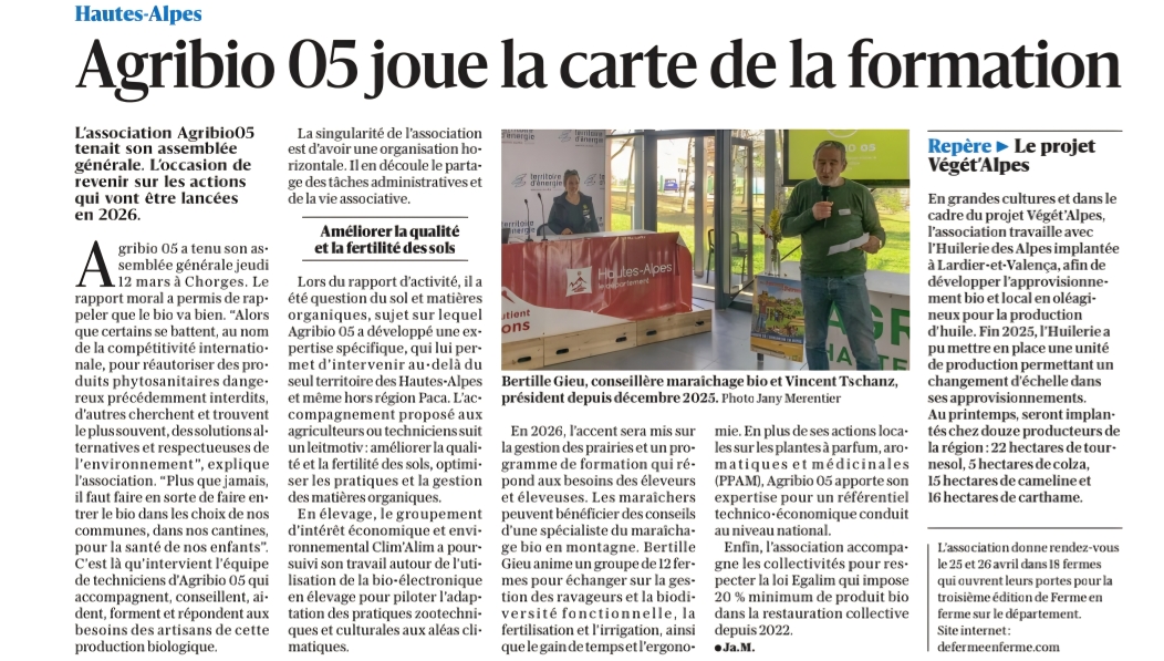 Et fait marquant pour cette année : Agribio 05 déménage ! A partir de mai 2026 vous pourrez nous retrouver au 8 avenue Guillaume Farrel à Gap !
