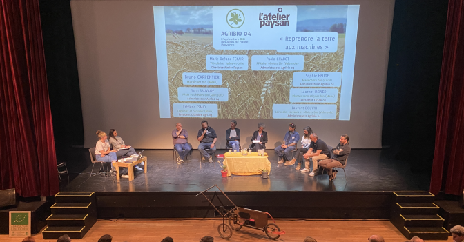 Après l’AG, une table-ronde ouverte au grand public a été organisée par l’association pour discuter de l’ouvrage « Reprendre la terre aux machines, manifeste pour une autonomie paysanne et alimentaire » (collection Anthropocène, au Seuil). Cet essai, sorti en mai 2021, est le fruit d’un travail d’écriture collectif d’un groupe de sociétaires de L’Atelier Paysan. Au travers de cet ouvrage, L’Atelier Paysan milite pour l’émergence d’un modèle d’agriculture qui aille dans le sens de l’autonomie paysanne et alimentaire. Il dessine ainsi l’histoire de l’industrialisation de l’agriculture et le rôle majeur mais ignoré de la machine agricole. A cette occasion, 7 agriculteur.trice.s, dont Marie-Océane Fekairi, Présidente du Directoire de l’Atelier Paysan, Frédéric Esmiol, Président de la Chambre d’Agriculture du 04, Laurent Depied, Président du comité économique des plantes à parfum, aromatiques et médicinales (CPPARM), et Président de la FDSEA du 04, Yann Sauvaire, Paolo Chabot, Sophie Heude, Bruno Carpentier et Laurent Bouvin, tous les 5 membres du CA d’Agribio 04, ont été conviés autour de la table. En tant qu’agriculteur.trice.s, les invités ont pu partager leur définition de l’autonomie, expliquer leur rapport avec les machines agricoles, et faire part des solutions et alternatives mises en place pour faire face aux répercussions du système agro-industriel sur leur travail.