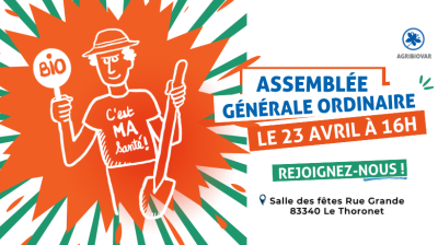 Nous avons le plaisir de vous inviter à l’Assemblée Générale Ordinaire d’Agribiovar, un moment important pour se retrouver, faire le bilan de l’année écoulée et partager ensemble les actions menées au service de l’Agriculture Biologique sur notre territoire.