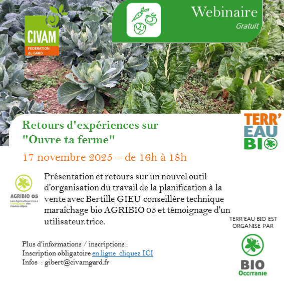 le Civam du Gard, Bio Occitanie, organise une webinaire avec l’intervention de Bertille Gieu et un temoignage de maraicher.ère qui utilise ouvretaferme : logiciel de planification de cultures,assolement, achat graines, production de plants, suivi d’itk et rendement, suivi de temps, vente/ logiciel de caisse, BL et facturation, site web, et site de vente en ligne.